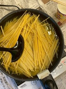 みんなパスタ7人前もゆでたことない&思ったより鍋が小さくて均等に火が入らない。 ここにきてまさかの