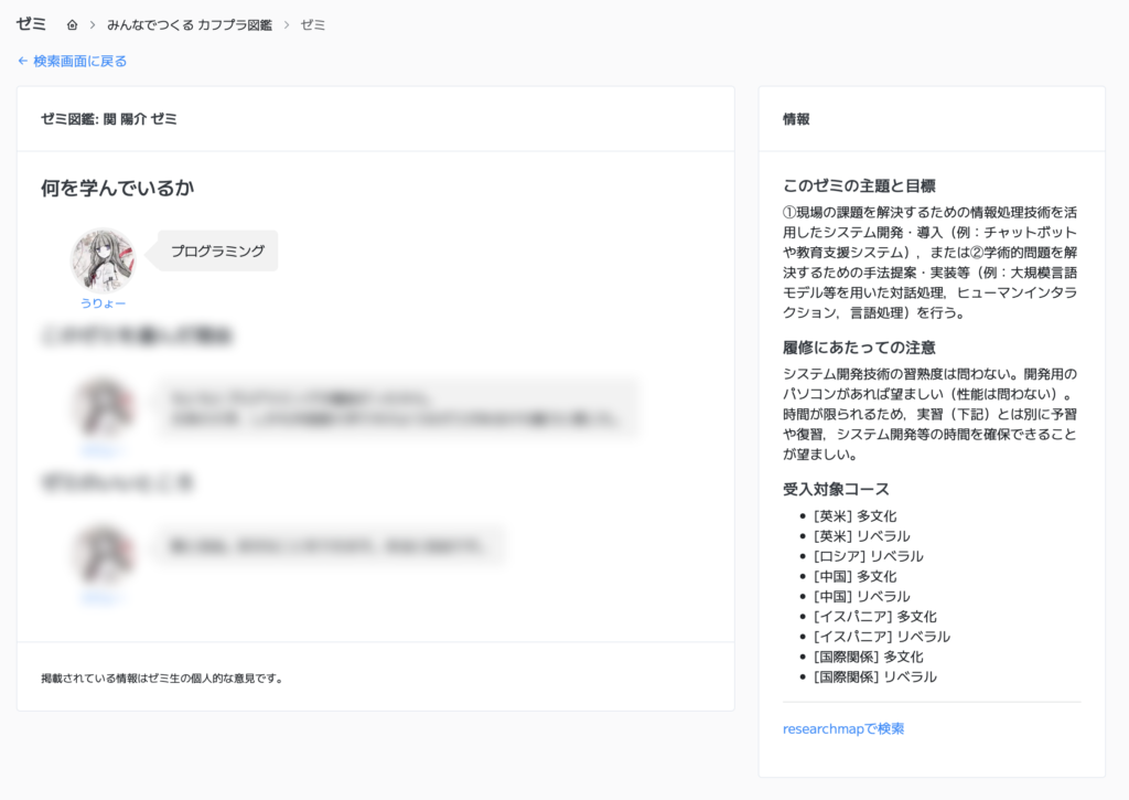 カフプラ図鑑機能では、「ゼミ」や「サークル・団体」の情報を見ることができます。
